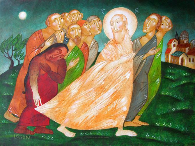 Julia Stankova (Bulgarian, 1954–), Christ healing the bleeding woman (2006), oil wooden panel.