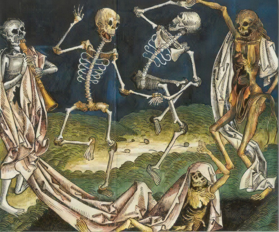 There is more. This may sound creepy to us today, but it is an ancient practice that originated in Catholic countries as a result of the constant exposure to plagues and death. This practice fits well with the Pope’s emphasis on remembering our judgment on the solemn Feast that comes immediately before Hallowtide. The Dance of Death emerged in a time (mid-14th C.) of frequent epidemics and death. In these plays death appeared not as the destroyer, but as the messenger of God summoning men to the world beyond the grave, a conception familiar both to the Holy Bible and to the ancient poets. The purpose of these plays was to teach the truth that all men must die and should therefore prepare themselves to appear before their Judge. The scene of the play was usually the cemetery or churchyard, though sometimes it may have been the church itself. The spectacle was opened by a sermon on the certainty of death delivered by a monk. At the close of the sermon there came forth from the charnel-house, usually found in the churchyard, a series of figures decked out in the traditional mask of death, a close-fitting, yellowish linen suit painted so as to resemble a skeleton. One of them addresses the intended victim, who is invited to accompany him beyond the grave. The first victim was usually the pope or the emperor. The invitation is not regarded with favor and several reasons are given for declining it, but these are found insufficient and finally death leads away his victim. A second messenger then seizes the hand of a new victim, a prince, or a cardinal, who is followed by others representing the various classes of society, the usual number being twenty-four. The play was followed by a second sermon reinforcing the lesson of the representation. Evidence for these plays has been found in Germany, Spain, Belgium, France, England, and Italy. Italy also had something known as the “Triumph of Death.”