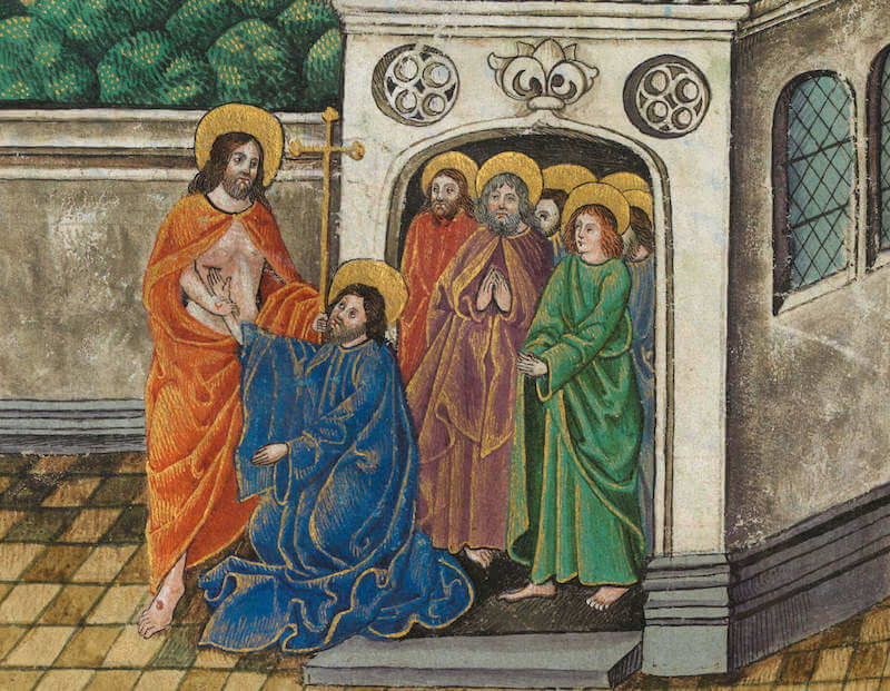 Jesús resucitado se aparece a los discípulos “al anochecer de aquel día, el primero de la semana”. Las puertas estaban cerradas, y el miedo había paralizado sus corazones. Pero Él se hace presente. No como un fantasma, ni como una idea, sino como una Persona viva que lleva en su cuerpo glorioso las señales del sufrimiento. Las llagas no han desaparecido. Son ahora gloriosas. Y es desde esas llagas que Cristo ofrece la paz, el perdón, la fe.